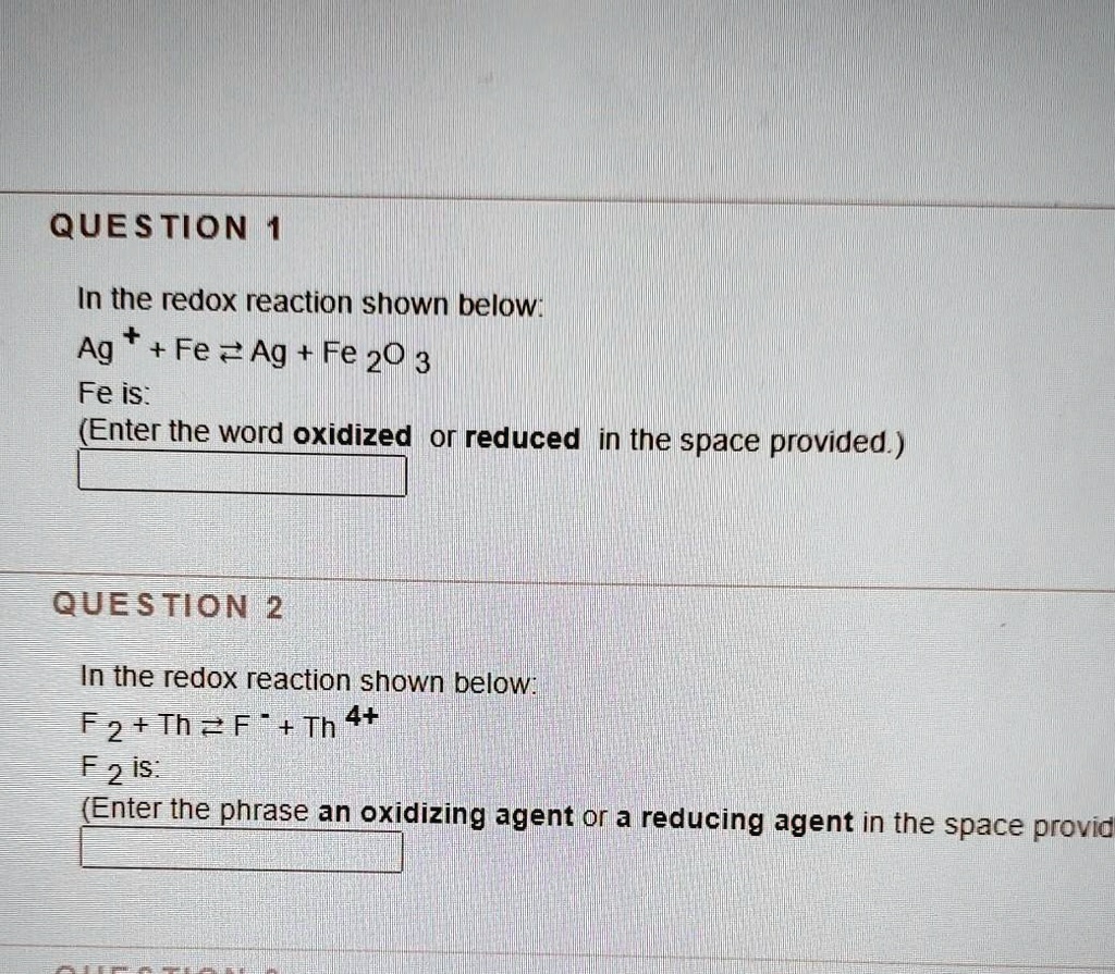 Solved Question 1 In The Redox Reaction Shown Below Ag Fe Zag Fe 20 3 Fe Is Enter The Word Oxidized Or Reduced In The Space Provided Que Stion 2 In The