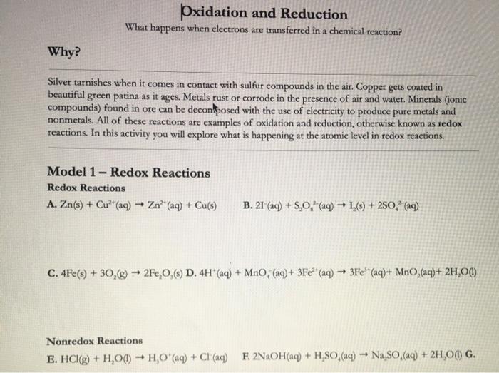 An oxidation-reduction redox reaction is a type of chemical reaction that involves a transfer of electrons between two species. The presence of which reactant is the best indicator of an oxidation-reduction reaction. Formation of a precipitate.